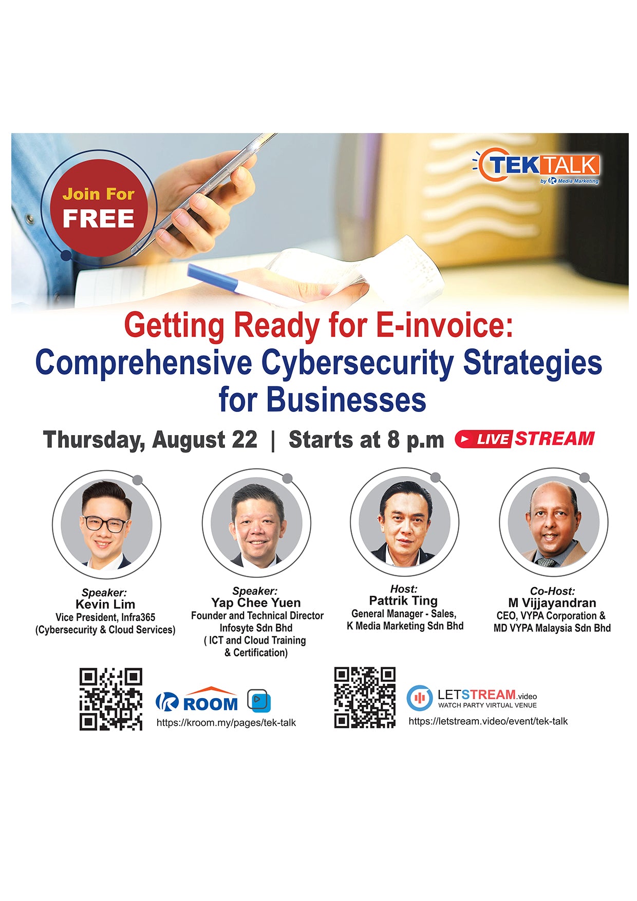 Are you ready to step into the era of e-invoicing? Join us to discover comprehensive cybersecurity strategies for businesses. Don’t miss the Tek Talk KROOM on August 22 (Thursday), at 8.00pm.